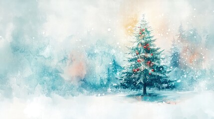 A Beautiful Snowy Christmas Tree Decorated with Red Ornaments and Candy Canes, Set Against a Festive Blue Background with Falling Snow, Evoking Holiday Cheer