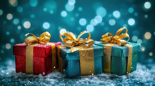 Red and teal gift boxes with gold ribbons on snowy surface against blurred blue background