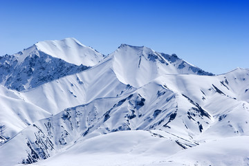 Snowy mountains in winter day near lake under dark sky at sunrise