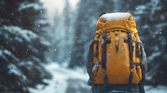 Adventurer hiking through a snowy forest with a yellow backpack in winter