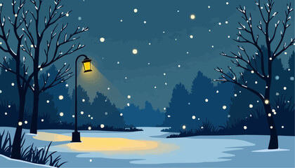 Winter Night Scene with Snow and Lamp Post