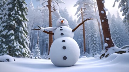 A cheerful snowman in a red and orange hat and scarf stands in a snowy forest with tall pine trees.