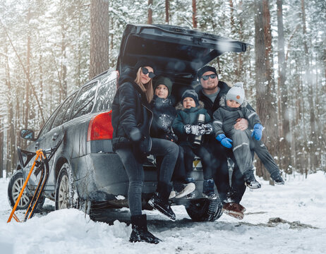 Weekends and relaxation. Journey of a caucasian family with car they enjoy and have fun in forest in cold season.