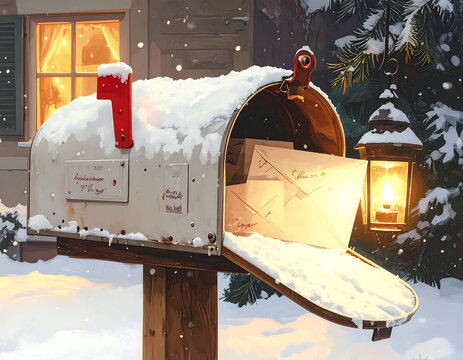 Snow covered mailbox with letter inside during winter.