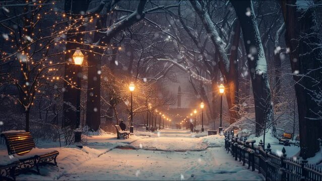 Beautiful winter snowy weather in streets of small town. Shallow depth of field, focus in foreground at white fluffy snowflakes.