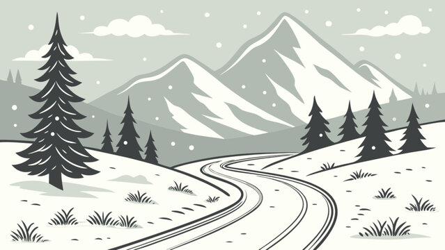 Winter landscape scene with snowy mountains and trees vector graphic illustration