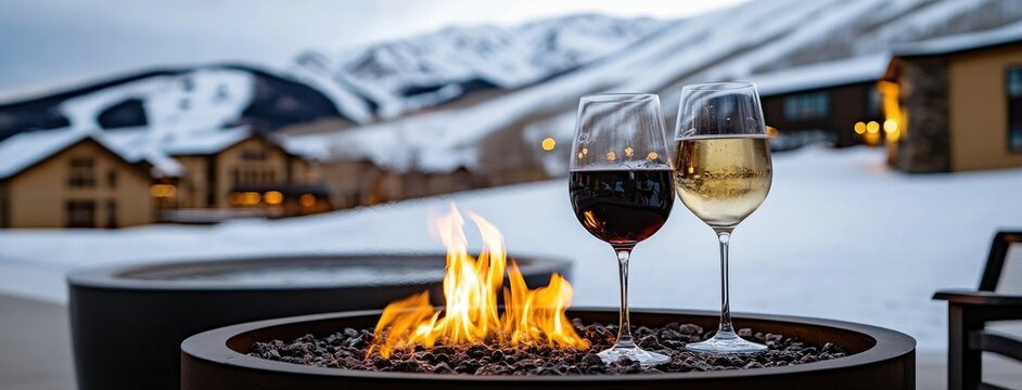 Enjoying rosé and white wine by the fire pit at The Contour with snowy mountains and ski slopes in the background