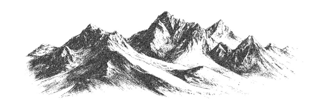 Pointillism mountain landscape with sharp ridges and snowy slopes. Monochrome stipple texture in vintage engraving style. Vector illustration