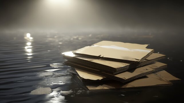 Waterlogged flattened cardboard boxes piled up in a flooded environment with dramatic lighting