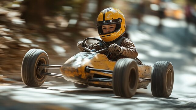Young boy kid participating in a competitive soapbox derby race. He's behind the wheel of his homemade racer, speeding down a steep hill with determination and a thrill for speed.