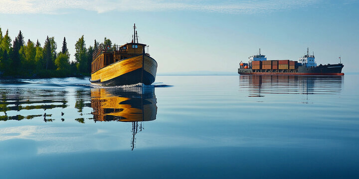 Wooden soapbox ferry navigating calm waters at dawn Generative AI