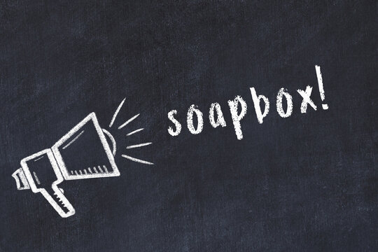 A wooden podium with a microphone in front of a blurred background of lights and a dark atmosphere