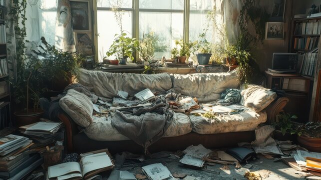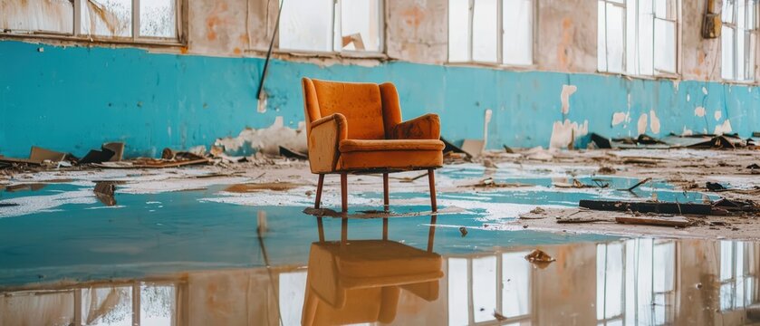 Flooded living space with debris on reflective water surface, ruined walls, empty armchair, somber mood, concept of water damage