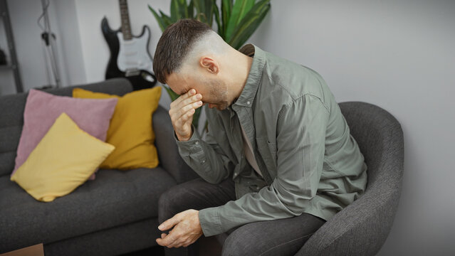 A distressed man sits on a sofa in a modern apartment, face in hand, showcasing worry or headache in a relatable domestic setting.