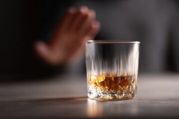 Alcohol refusal concept, man pushing away whisky glass choosing sobriety