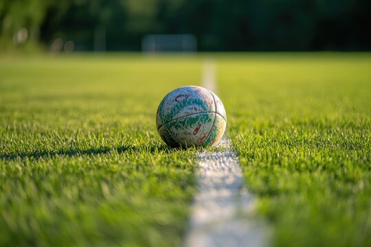 A soccer ball sits on a grassy field, near a white boundary line.  Sunlight highlights the ball and grass