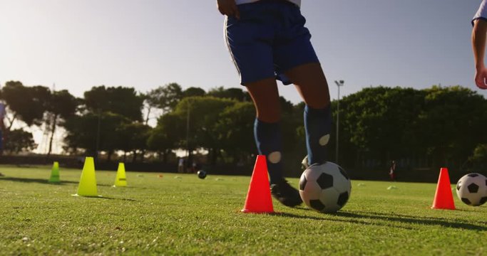 4K Low angle of kids training with a soccer ball on a field. Shot in slow motion on RED Epic.