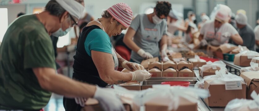 Volunteers in an assembly line diligently pack food boxes in a community effort, reflecting teamwork, compassion, and a spirit of giving.