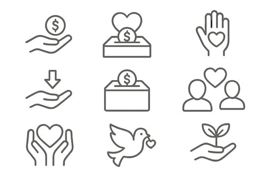 Charity and donation thin line icons set for social causes. Minimalist vector symbols for volunteering, fundraising, support, community, hope, love, and humanity concept.