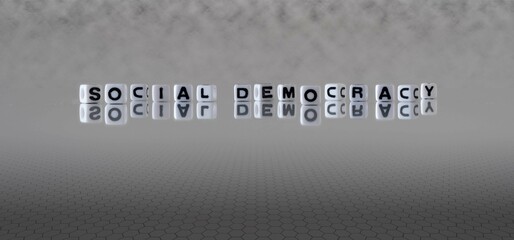 social democracy word or concept represented by black and white letter cubes on a grey horizon background stretching to infinity