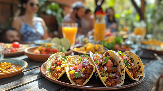 Colorful tacos on rustic table with blurry people enjoying mexican food in outdoor setting