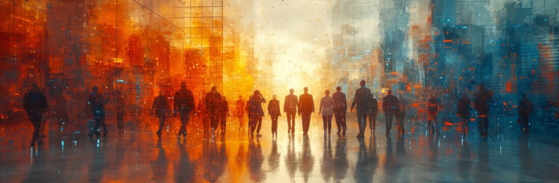 A Painting of a Group of People Walking Down a Street