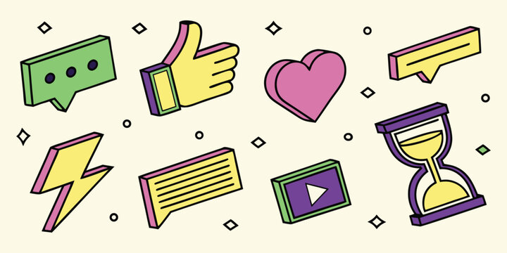 Isometric social media icon set. Retro 3D vector graphics with like, heart, and chat bubble for marketing, web, and app UI.
