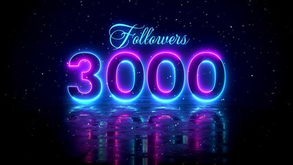 Futuristic Blue Purple Glowing Neon Light 3000 Followers Text Reveal With Floor Reflection Amid The Falling Snow On Dark Background, 5-15 Seconds Seamless Loop