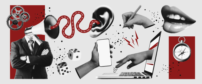 Halftone vector illustration of digital manipulation and disinformation concept. Abstract collage with propaganda, fake news, media influence, social media, technology, communication elements. Vector.
