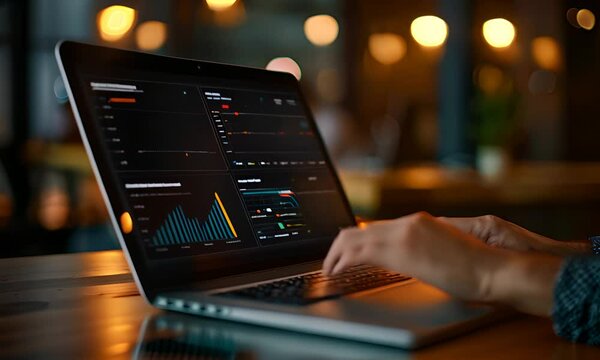 A close-up shot of a hand typing on a laptop keyboard with digital marketing analytics dashboard on the screen