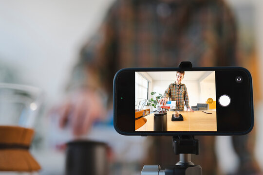 Female influencer vlogger getting ready to show how to make up live on IG story reel tiktok at home studio. Gen Z people are filming viral video capture apps