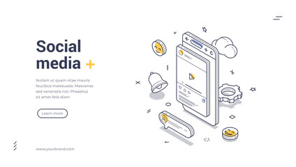 Social media concept web banner template, including a smartphone and various graphic elements. Ideal for digital marketing and creative projects. Modern isometric vector illustration