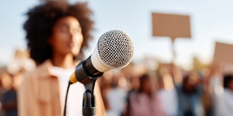 Professional High-Quality Microphone Focus at Outdoor Protest with Diverse Crowd Authentic Social Movement and Public Speaking Content for Marketing Campaigns