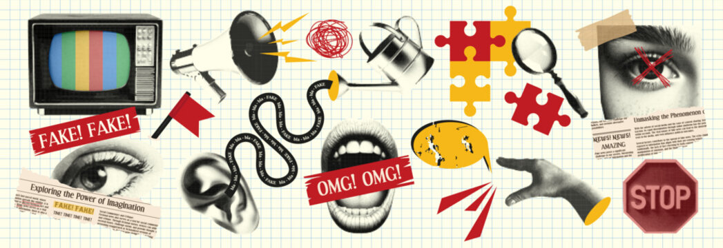 Trendy collage of fake news in a halftone style. Hand, TV, eye, torn newspaper, texture in halftones, dot pop art style. Vector illustration for banners, posters, social networks.