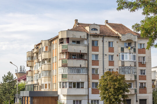 Old apartment block from communist era in Eastern Europe. Communist socialist architecture style flat. Dreary and depressive rust-eaten building.