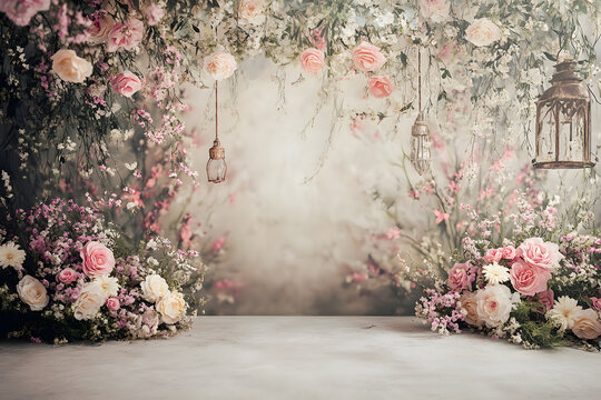 Maternity backdrop, wedding backdrop, photography background with delicate flowers and vintage wall.