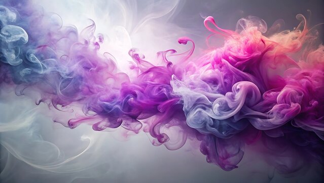 Vibrant swirls of purple and pink hues amidst wispy tendrils of smoke against a soft gray background