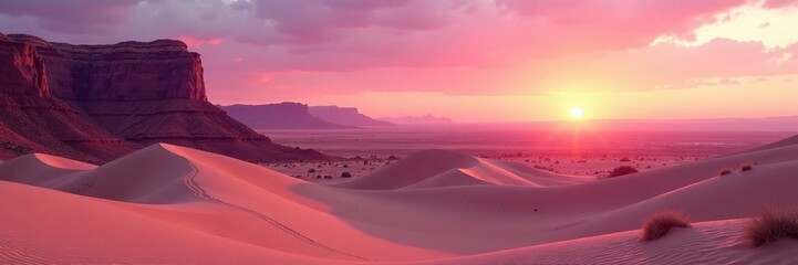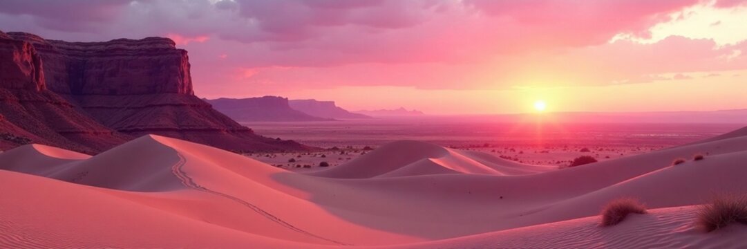 Soft pink hues of dawn break over sandy dunes, Sonoran Desert landscape, sunrise in desert, sandstone formations