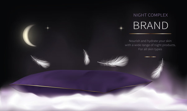 Night background for advertising of cosmetic products. Dark night sky with moon and stars, purple velvet pillow on white fluffy cloud, flying soft feathers, cosmetics promotion concept for magazine