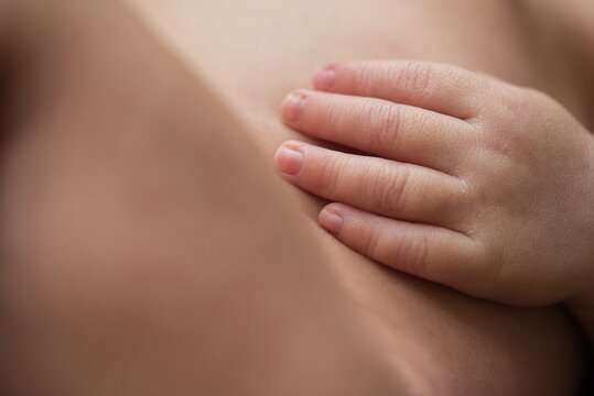Closeup anonymous nude infant touching soft skin of body while resting at home