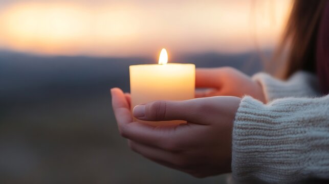 Woman's hands gently hold a lit candle at sunset, creating a serene and peaceful atmosphere. The warm glow of the candle contrasts beautifully with the soft, muted tones of the twiligh : Generative AI