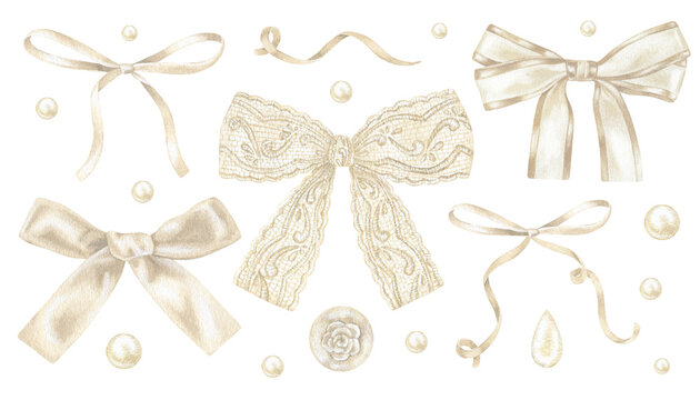 Elegant watercolor set of beige satin bows and ribbons in vintage pastel tones. Perfect for wedding invitations, greeting cards, and decorative stationery. Hand drawn detailed with soft textures