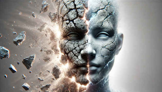 "The stone gradually changes into a living human form, the stone texture changes to a softer skin, an ancient mysterious atmosphere."