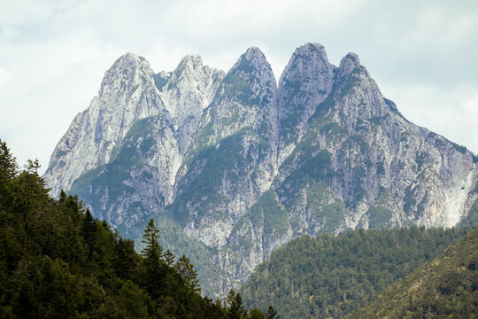 Aerial view of the stark, jagged peaks rise majestically against the softer green foothills, a symphony of stone and verdant life, Tarvisio, Friuli-Venezia Giulia, Italy.