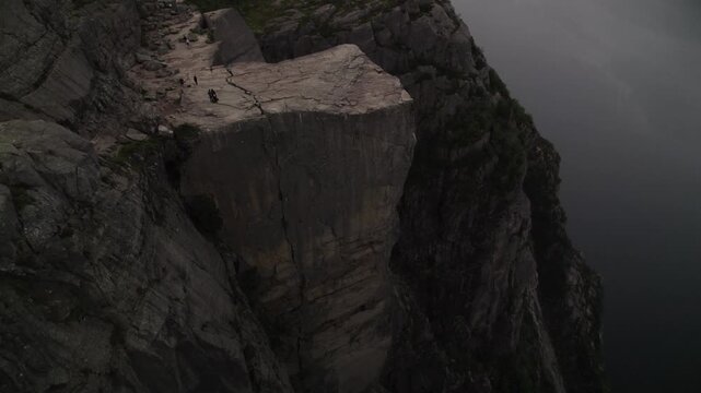 Aerial view of the dramatic Preikestolen cliff, its sharp edges contrasting with the softer textures of the surrounding landscape, Songesand, Rogaland, Norway.
