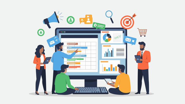 Web traffic growth on computer screen, website ranking on search page, conversion data analytics on dashboard. Digital marketing and advertising concept. Vector illustration.