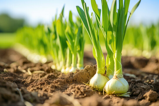Super close up of young corn seedlings growing in a fertile soil in a summer with a sunset sky. Agriculture.