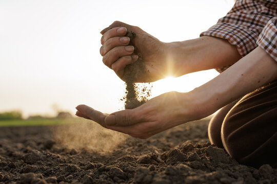 Male farmer's hand holds a handful of dry ground and checks soil fertility and quality before sowing crops on plowed field at sunset. Cultivated land. Concept of organic agriculture and agribusiness