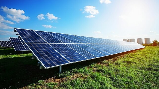 solar panels, batteries, on clean field. concept clean energy
