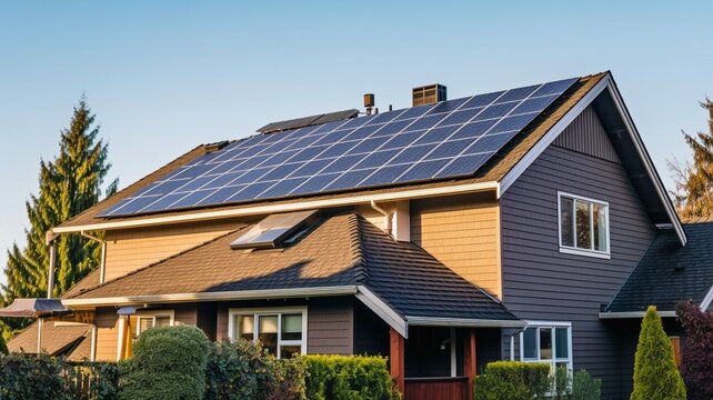 Solar panels on a pitched roof. A beautiful modern home and solar energy. Rays of sunlight. Visualization - video effect, outline